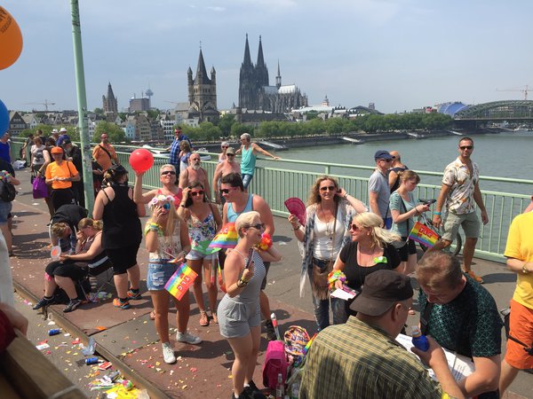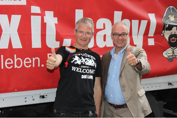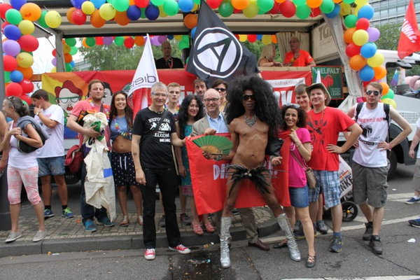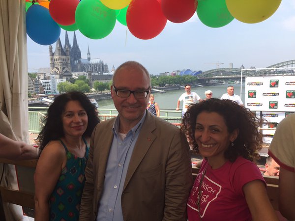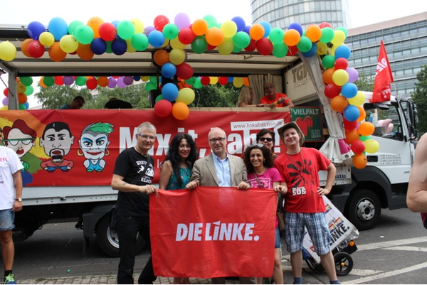Mit der LINKEN Kölner Ratsfrau Güldane Tokyürek, Figen Malecki (LINKE) vom Kölner Integrationsrat und vielen engagierten queeren Genoss*innen und der Linksjugend [solid'] fuhr ich heute auf dem Wagen der Linksfraktion im Bundestag bei weit über dreißig Grad beim CSD mit. Wir winkten und flirteten mit den Hunderttausenden Kölner*innen, die sich die Parade ansahen und mit unglaublich kreativen Outfits, Schildern, Bannern und Sprüchen deutlich machten, dass sie die Vielfalt leben. In jeder Hinsicht gleiche Rechte für alle LGBTTIs, darum ging es auch heute! Es hat mir viel Spaß gemacht, auch wenn uns die ein oder andere Wasserpistole oder Gartenschlauch voll erwischte. Gar nicht so schlecht, denn heiß war es in jeder Hinsicht... Ganz besonders gefreut hat mich, dass mein Fraktionskollege Harald Petzold, Sprecher für Lesben-, Schwulen- und queere Politik, extra nach Köln gekommen war und unermüdlich Menschen begrüßte und Material verteilte. Der Kölner CSD 2015, er war mit knapp einer Million Menschen ein deutliches Zeichen gegen jedwede Homophobie und für gleiche Rechte für Alle. Und er zeigt eindrücklich: Jede Jeck is anders.