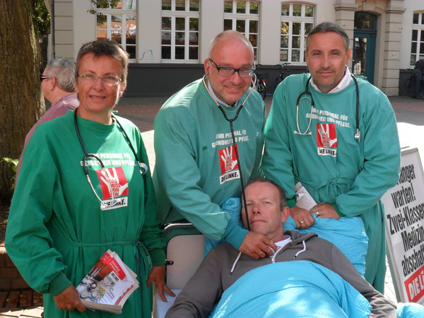 Auch in Frechen habe ich gemeinsam mit meinen Fraktionskolleg*innen Kathrin Vogler (Steinfurt) und Dr. Alexander S. Neu (Rhein-Sieg-Kreis) bei der gesundheitspolitischen Infotour der Bundestagsfraktion DIE LINKE durch NRW für eine Solidarische Krankenversicherung geworben. Gemeinsam mit vielen Genossinnen und Genossen aus dem Rhein-Erft-Kreis haben wir an diesem sonnigen Freitag viele Menschen erreicht und dabei unsere Alternativen zur Gesundheits- und Pflegpolitik der Großen Koalition in Berlin dargestellt. Rund um den Klüttenbrunnen wurden vier Krankenhausbetten platziert. Am Kopfende wurden mittels Parkuhren die erstaunten Betrachter*innen zur Zahlung horrender Liegegebühren aufgefordert.