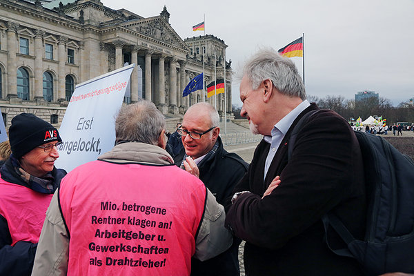 Zu unserem Antrag ‚Gerechte Krankenversicherungsbeiträge für Direktversicherungen und Versorgungsbezüge - Doppelverbeitragung vermeiden‘ (18/6364) fand heute im Ausschuss für Gesundheit eine Sachverständigen-Anhörung statt. Unmittelbar vor Beginn sprach ich auf der Mahnwache der Betroffenen vor dem Reichstagsgebäude. „Bei der doppelten Verbeitragung von Betriebsrenten handelt es sich um nichts anderes als um eine kalte Enteignung! Mit der Gesetzesänderung von 2004 haben Ulla Schmidt und Horst Seehofer die Krankenkassen auf Kosten der Betriebsrentnerinnen und –rentner saniert. Das ist eine große Ungerechtigkeit. Gewerkschaften, Sozial- und Verbraucherschutzverbände und sogar die Arbeitgeber werden das Anliegen der LINKEN, die doppelte Verbeitragung von Direktversicherungen abzuschaffen, heute unterstützen. Mein großes Lob geht an den Verein ‚Direktversicherungsgeschädigte e.V‘, der nicht nur die Mahnwache organisiert hat, sondern fast täglich Briefe und Mails an die Verantwortlichen von Union und SPD schreibt und auch den Gang vors Verfassungsgericht nicht scheut. Aus der Nummer kommen Union und SPD nicht mehr raus! DIE LINKE steht voll und ganz hinter den Betroffenen.“