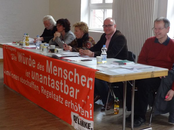 Ebenso klar war die Übereinstimmung mit meinen Mitreferent*innen Prof. Dr. Ute Fischer von der FH Dortmund (2.v.l) und Prof. Dr. Christoph Butterwegge (r.) bei der von Jürgen Aust (Landesvorstand DIE LINKE, 1. v. l) und Agi Schwedt (Sprecherin der LAG, Mitte) kompetent moderierten Diskussion, dass der von der Bundesregierung vorgelegte Entwurf für eine sog. ‚Rechtsvereinfachung‘ kein Ende der Repressionsspirale bringen wird. Im Gegenteil: Mit der Ausdehnung der Rückforderungsansprüche bei sogenanntem ‚sozialwidrigem Verhalten‘ will die große Koalition das Sonderrechtsystem Hartz IV weiter verschärfen.