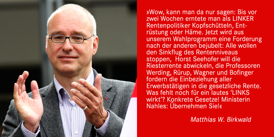Wow, kann man da nur sagen: Bis vor zwei Wochen erntete man als LINKER Rentenpolitiker Kopfschütteln, Entrüstung oder Häme. Jetzt wird aus unserem Wahlprogramm eine Forderung nach der anderen bejubelt: