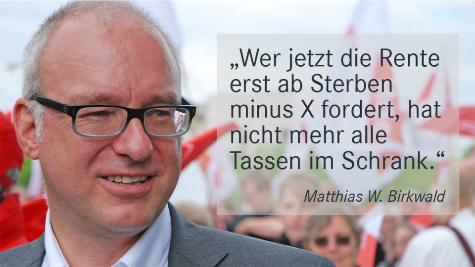 Birkwald weiter: Ältere werden von den Arbeitgebern und Arbeitgeberinnen, deren Interessen Schäuble offenkundig vertritt, fast nicht mehr eingestellt. Die Zahl der arbeitslosen 60- bis unter 65-Jährigen hat im vergangenen Jahrzehnt um mehr als das Dreieinhalbfache zugenommen. Ihre Arbeitslosenquote lag 2014 mit 8,3 Prozent weit über der Arbeitslosenquote von 15-65jährigen (6,7 Prozent). Die durchschnittliche Arbeitslosigkeitsdauer von 55- bis 64-Jährigen ist mit 93 Wochen deutlich länger als bei allen Altersklassen (69 Wochen). Wer jetzt die Rente erst ab Sterben minus X fordert hat nicht mehr alle Tassen im Schrank. Herrn Schäubles Forderung nach der einer Rente nach Lebenserwartung ist komplett fernab jeglicher Lebensrealität. Er sollte seinen Unternehmerfreunden und -freundinnen lieber Beine machen, alters- und alternsgerechte Arbeitsplätze einzurichten. Und er sollte mal Todesanzeigen lesen und lernen, wie viele Menschen keine 70 werden. Wer arm ist stirbt nämlich früher. Schäuble will den Armen noch mehr Rente klauen. Das muss verhindert werden!