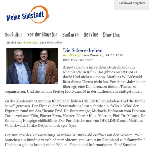 "Armut? Bei uns im reichen Deutschland? Im Rheinland? In Köln? Das gibt es nicht! Gibt es doch! Und nicht zu knapp. Matthias W. Birkwald lässt dieses Thema nicht los. Vor einem Jahr hat er überlegt, eine Konferenz zu diesem Thema zu organisieren. Und die hat am Freitag (20.05.2016) in der Lutherkirche stattgefunden. [...]