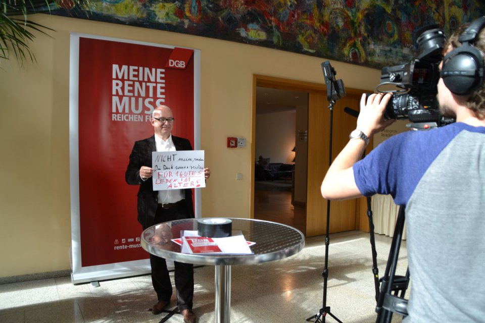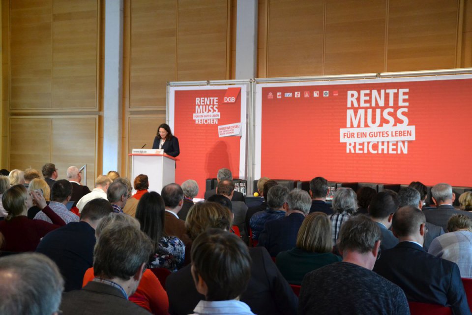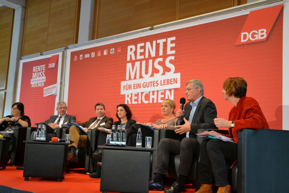 Der DGB und seine Mitgliedsgewerkschaften fordern einen Kurswechsel in der Rentenpolitik. Um die Rentenkampagne der Gewerkschaften vorzustellen und mit der Politik ins Gespräch zu kommen, hatte der DGB am 20. September 2016 zu einer Tagung nach Berlin eingeladen. Mit DGB-Vorstandsmitglied Annelie Buntenbach diskutierten auf dem Podium Grünen-Vorsitzende Simone Peter, Carola Reimann MdB (SPD), Bernd Riexinger, Vorsitzender der Partei DIE LINKE, Karl Schiewerling MdB (CDU) und N.N. (CSU). Bernd Riexinger erhielt viel Zuspruch aus dem Publikum und Zwischenapplaus für LINKE rentenpolitische Forderungen.