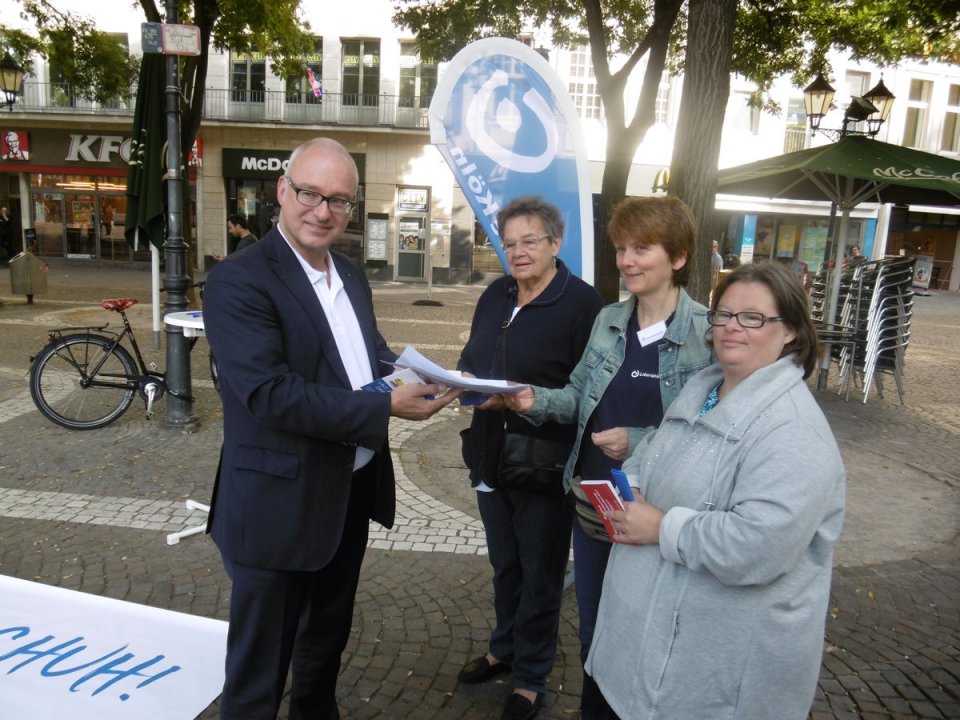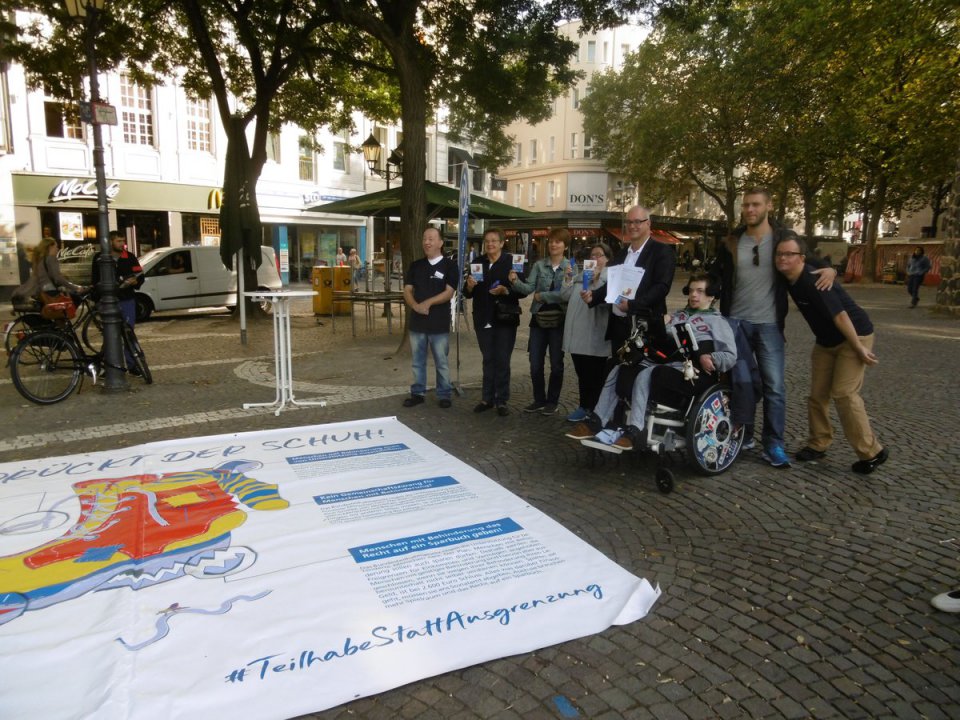 "Wo drückt der Schuh?" frug mich die mit Trisomie 21 zur Welt gekommene Heike, als sie mir mit einem freundlichen Lächeln einen Schuhanzieher und den Flyer mit den Forderungen der Lebenshilfe in die Hand drückte. Gerne war ich kurz vorher der Einladung der "Lebenshilfe Köln" gefolgt, ihren nur allzu berechtigten Protest gegen den unzureichenden Gesetzentwurf der Bundesregierung für ein Bundesteilhabegesetz und ihre fünf Kernforderungen zu unterstützen. Bei der Übergabe des Positionspapiers und zweier Anträge der LINKSfraktion an die Geschäftsführerin Frau Silke Mertesacker wurde deutlich: DIE LINKE. im Bundestag unterstützt die Forderungen der Verbände und Selbstorganisationen nach einem Bundesteilhabegesetz, das den Ansprüchen der UN-Konvention über die Rechte von Menschen mit Behinderungen gerecht wird.