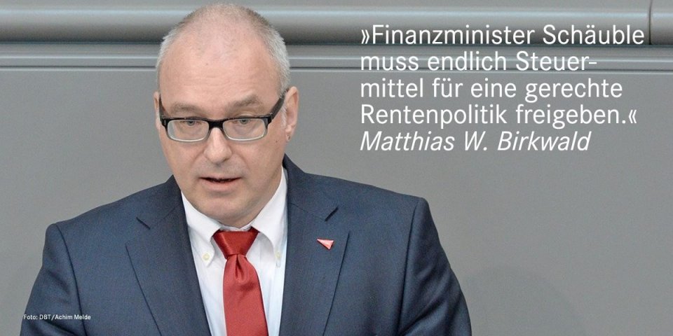 „Finanzminister Schäuble muss endlich Steuermittel für eine gerechte Rentenpolitik freigeben“, fordert Matthias W. Birkwald, rentenpolitischer Sprecher der Fraktion DIE LINKE, nach dem vertagten Spitzentreffen der großen Koalition zur Rente. Birkwald weiter:
