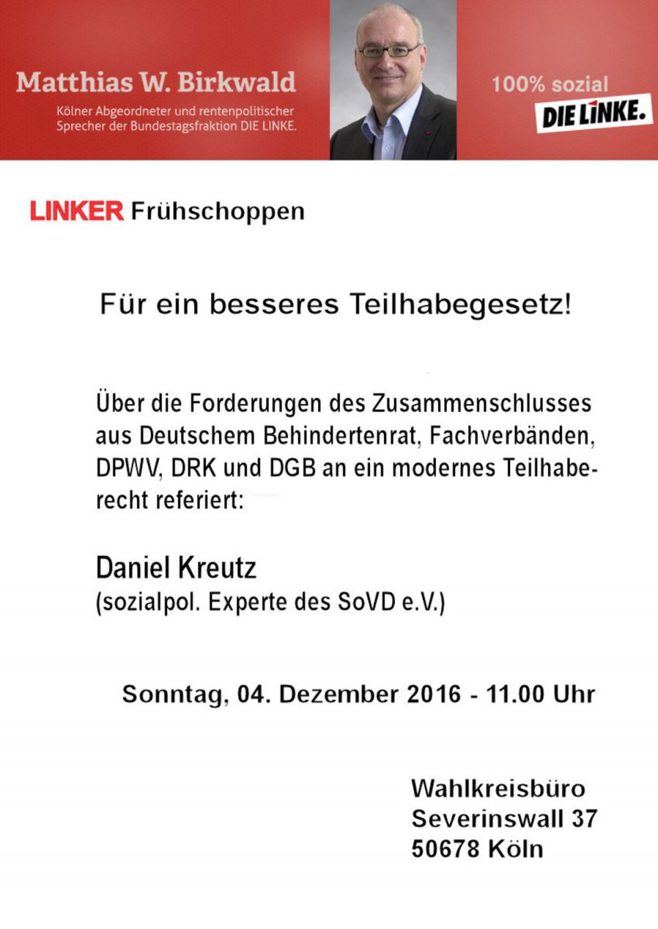 Daniel Kreuz (sozialpolitischer Experte des SoVD e.V.) berichtet über die Forderungen des Zusammenschlusses aus Deutschem Behindertenrat, Fachverbänden für Menschen mit Behinderungen, DPWV, DRK und DGB an ein modernes Teilhaberecht, welches aus dem Fürsorgesystem herausführt. Ort: Wahlkreisbüro, Severinswall 37, 50678 Köln.
