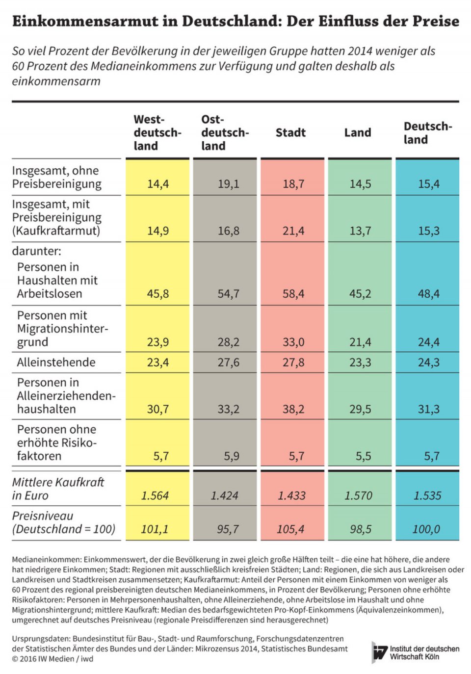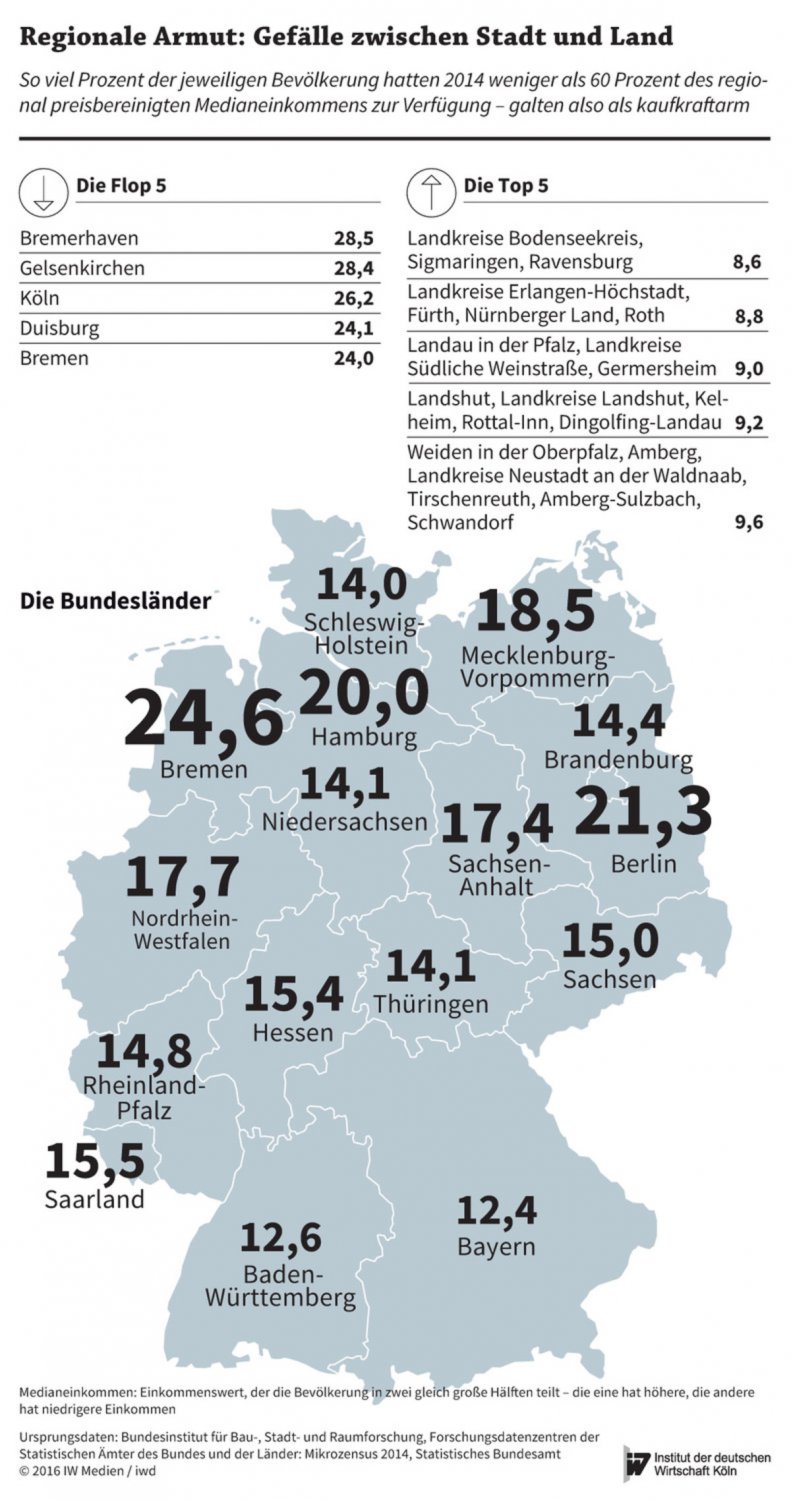 Die vom IW vorgelegte Studie stellt zunächst heraus, dass Einkommensarmut in besonderer Ausprägung vor allem in den östlichen Bundesländern und den städtischen Regionen mit Strukturproblemen in den westlichen Bundesländern zu finden ist. Allerdings bereinigt man die regional erzielten Einkommen der Menschen um ihre jeweilige regionalspezifische Kaufkraft, ergibt sich weiter ein differenzierteres Bild: demnach verringert sich die „Armutsinzidenz“ in den östlichen Bundesländern spürbar, während Städte – mit ihren höheren Preisniveaus – eine stärker ausgeprägte Armut aufweisen.