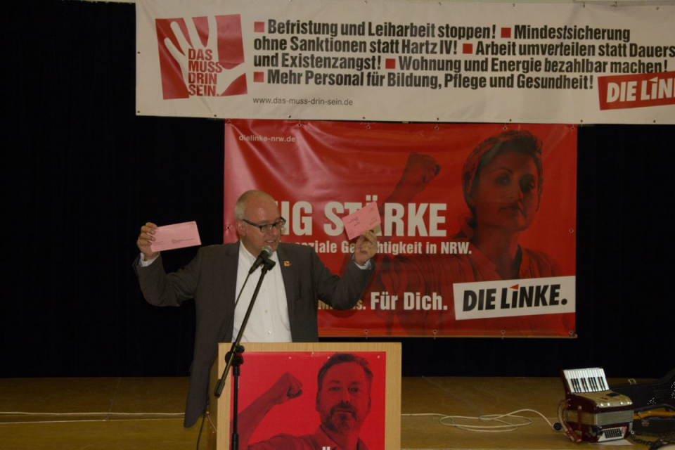 Nachdem Siegfried Dörr für den DGB die großen arbeitsmarktpolitischen Übereinstimmungen mit der LINKEN herausstellte und Christian Leye mit einer fulminanten Rede über die sozialpolitischen Kernforderungen der LINKEN. NRW im Landtagswahlkampf 2017 reüssierte, stellte ich - nach einem Werbeblock für die Teilnahme an den Sozialwahlen - den rentenpolitischen Aspekt unseres Konzepts für ein gerechtes Nordrhein-Westfalen in den Vordergrund, was sehr große Schnittmengen mit den Rentenvorstellungen des DGBs hat. Wir LINKEN in NRW haben in unserem Landtagswahlprogramm der Rente viel Platz eingeräumt - auch wenn über die Rente auf Bundesebene entschieden wird. Wir müssen etwas gegen die deutlich zunehmende Altersarmut tun und die gesetzliche Rente muss den Lebensstandard wieder sicher. Das heißt: Das Rentenniveau muss wieder rauf auf 53 Prozent und wir fordern eine Solidarische Mindestrente in Höhe von 1050 Euro netto, denn jeder Mensch in NRW soll in Würde im Ruhestand leben können. Mit der auch vom DGB unterstützten Forderung, die Rente nach Mindestentgeltpunkten zu entfristen, wollen wir Menschen, die lange Jahre gearbeitet haben, eine Rente oberhalb der Solidarischen Mindestrente ermöglichen.