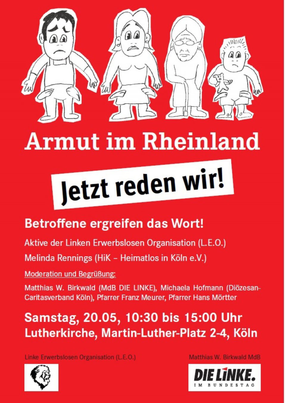 Armut ist in Köln ein massenhaftes Problem: Rund 200.000 Menschen sind betroffen, fast jede*r fünfte Kölner*in gilt nach den amtlichen Statistiken 2015 als von Armut bedroht. Jedes vierte Kind in Köln lebt von Hartz IV. Am 20. Mai 2016 hatte die Bundestagsfraktion DIE LINKE zur Konferenz ‚Armut im Rheinland‘ in die Lutherkirche geladen: Gut 350 Menschen stimmten mit Expert*innen aus dem Bundestag, den Sozialverbänden, Gewerkschaften und Kirchen darin überein, dass eine andere Politik nötig ist: Durch Umverteilung gesellschaftlichen Reichtums muss die massenhafte Armut überwunden werden. Doch zuWort kamen überwiegend die Expert*innen. Und in der Stadtgesellschaft herrscht weiterhin peinliches Schweigen zum Skandalmassenhafter Armut in einemreichen Land. Daswollen wir gemeinsam mit Ihnen ändern.