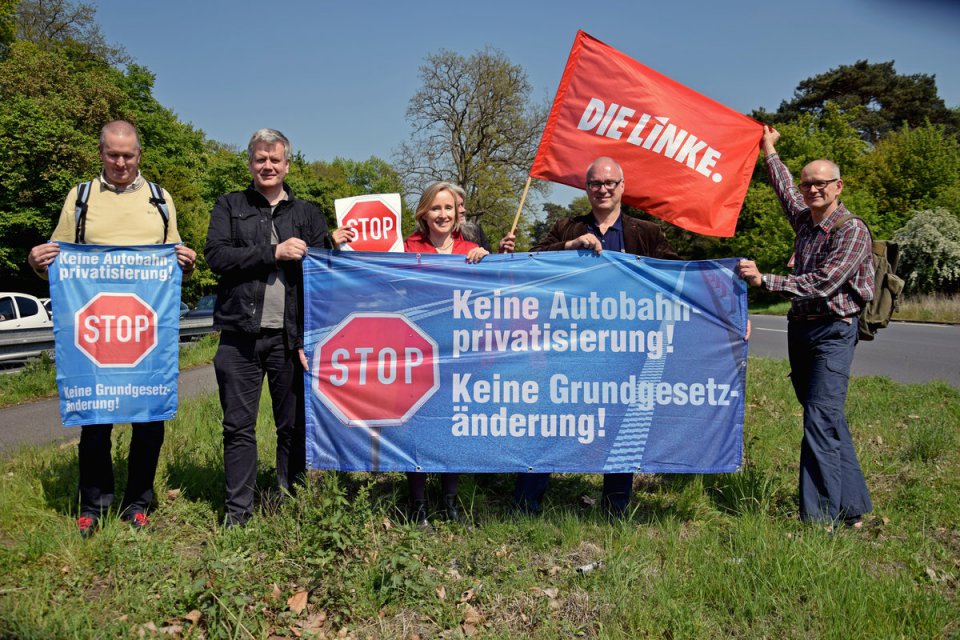 Mit einer Aktion am Bonner Verteilerkreis, machte heute DIE LINKE. zusammen mit der Direktkandidatin für den Landtag NRW, Gunda Wienke, und dem Bundestagsabgeordneten Matthias W. Birkwald, auf die drohende Privatisierung der Bundesautobahnen aufmerksam.Schon in der kommenden Sitzungswoche will die große Koalition eine Grundgesetzänderung durchbringen, um damit die Bundesautobahnen an Finanzinvestoren zu verkaufen. DIE LINKE. stellt sich gegen die Privatisierung und den Ausverkauf der Bundesautobahnen.