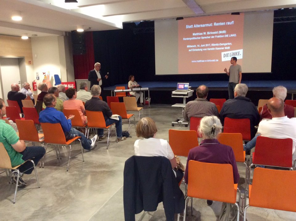Matthias W. Birkwald, ein echter Kölner aus dem Rheinland, kam am 14. Juni 2017 auf Einladung von Kerstin Kassner nach Ribnitz-Damgarten - in das sehr gelungen sanierte neue Begegnungszentrum der Stadt. Kerstin Kassner ist kommunalpolitische Sprecherin und Matthias W. Birkwald rentenpolitischer Sprecher der Fraktion DIE LINKE im Bundestag.