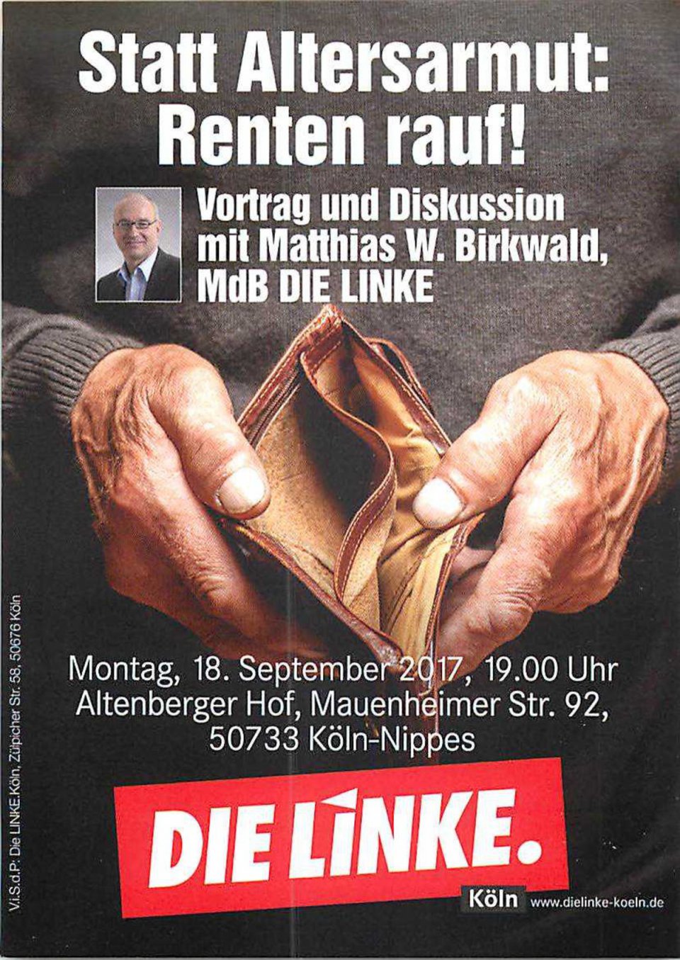 Am 18. September 2017 um 19.00 Uhr bin ich mit meinem Vortrag "Statt Altersarmut: Renten rauf!" im Altenberger Hof, Mauenheimer Str. 92, 50733 Köln.
