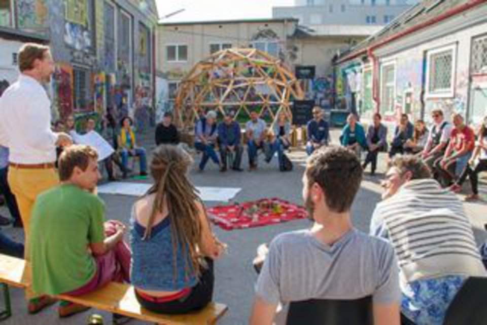 Der Europe Dome ist eine Holzkonstruktion. „Mit ihrer Netzwerkstruktur bildet die Kuppel ein Sinnbild für die notwendige demokratische Statik und kulturelle Vielfalt Europas und ein Zukunftsbild für die solidarische Gesellschaft einer globalisierten Welt“, erklärt Quarz.