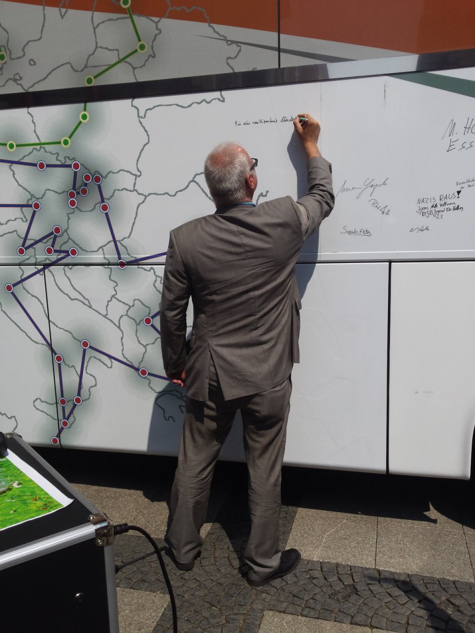 Gegen 14.00 Uhr ging eine Gesprächsrunde mit Vertretern von Caritas, Diakonie, AWO und dem Armutsnetzwerk vertieft auf die inhaltliche Arbeit vor Ort ein. Der Caritasdirektor Wolfgang Langer des Bistums Erfurt nutzte ebenfalls die Möglichkeit eines Rundgangs und setzte ebenfalls seine Unterschrift auf den EMIN Bus.