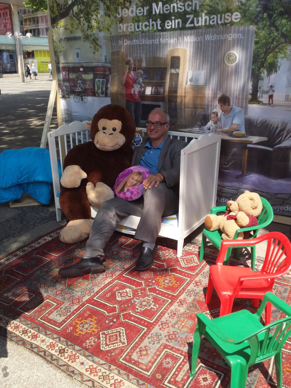 Der erste Prominente war Matthias Birkwald (MdB, DIE LINKE.), der zu einer Fragestunde zur Verfügung stand und sich nachher am Stand der Caritas im Zimmer ablichten ließ, um nochmal auch bildlich mit auf die schwierige Wohnungssituation hinzuweisen.
