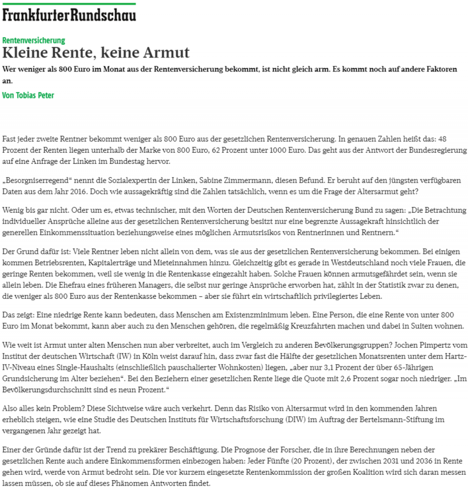 Einer der Gründe dafür ist der Trend zu prekärer Beschäftigung. Die Prognose der Forscher, die in ihre Berechnungen neben der gesetzlichen Rente auch andere Einkommensformen einbezogen haben: Jeder Fünfte (20 Prozent), der zwischen 2031 und 2036 in Rente gehen wird, werde von Armut bedroht sein. Die vor kurzem eingesetzte Rentenkommission der großen Koalition wird sich daran messen lassen müssen, ob sie auf dieses Phänomen Antworten findet.“
