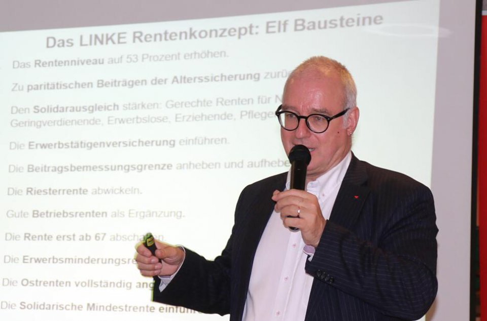 Jetzt heisse es für Die Linken reale Forderungen umzusetzen, auch aus der Opposition heraus. Abschließend stellte er noch die elf Bausteine des Linken Rentenkonzepts und eine Auswahl der Parlamentarischen Initiativen vor.