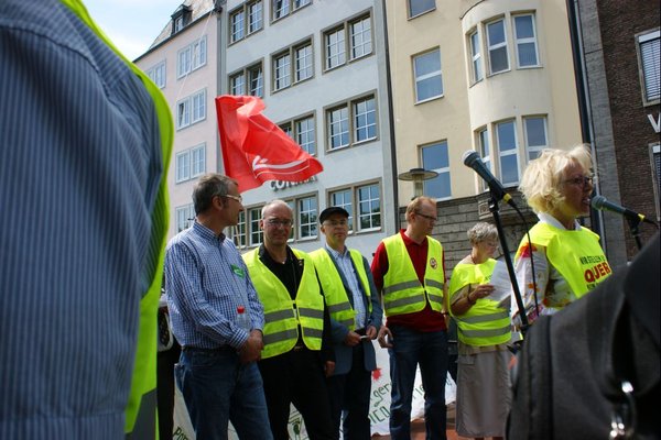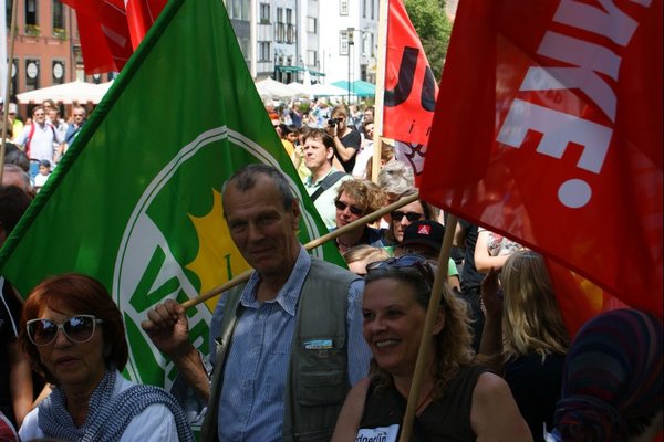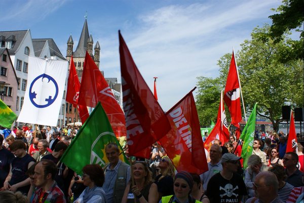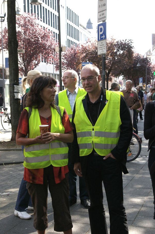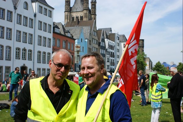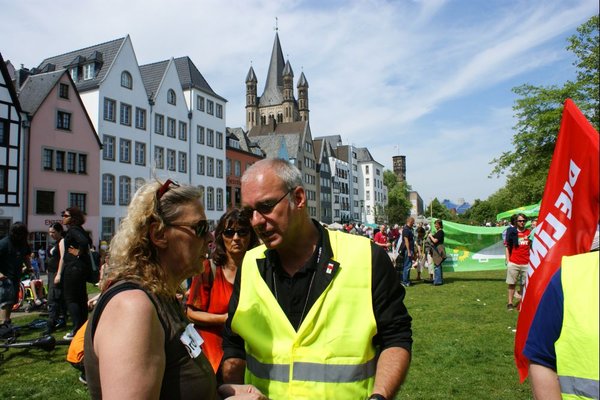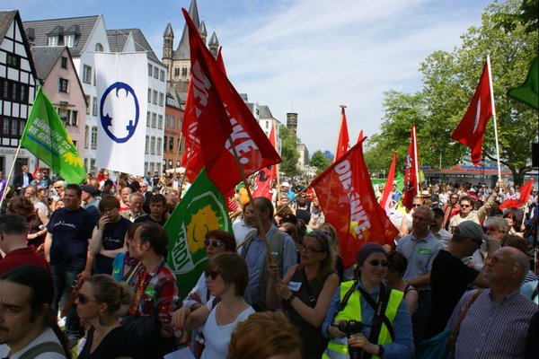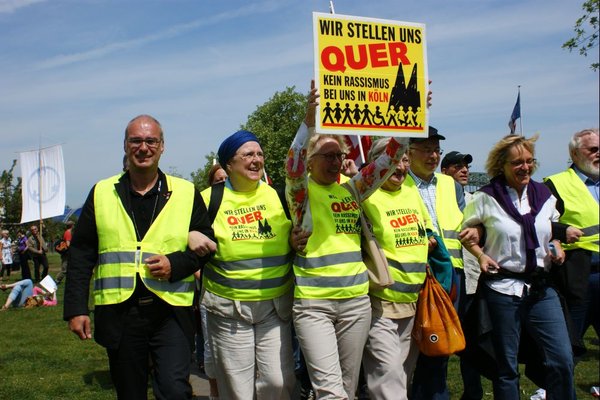 Unter den GegendemonstrantInnen ging in erster Reihe unser Kölner Bundestagsabgeordneter Matthias W. Birkwald gemeinsam mit R. Öztürk (DITIB), Oberbürgermeister Roters, Bürgermeisterin E. Scho-Antwerpes, der Vorsitzenden des Katholikenausschusses, Frau H. Bartscherer, J. Detjen (LINKE im Rat der Stadt Köln) und S. Wolf vom DGB. Die TeilnehmerInnen demonstrierten gegen den Marsch der rechtsextremen Organisation. Mit dem Motto „Köln stellt sich quer – Köln ist bunt und nicht braun“ zeigte die Stadt deutlich, dass das Miteinander in allen unterschiedlichen Facetten lebens- und liebenswert ist.