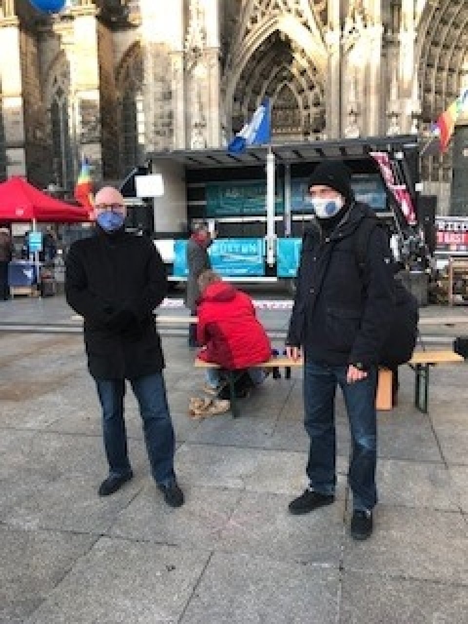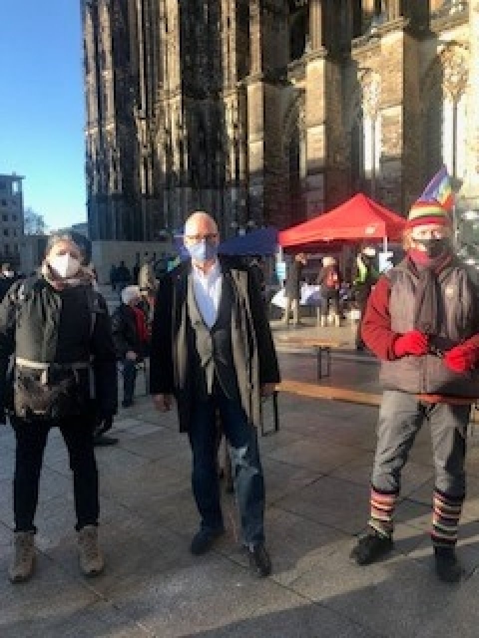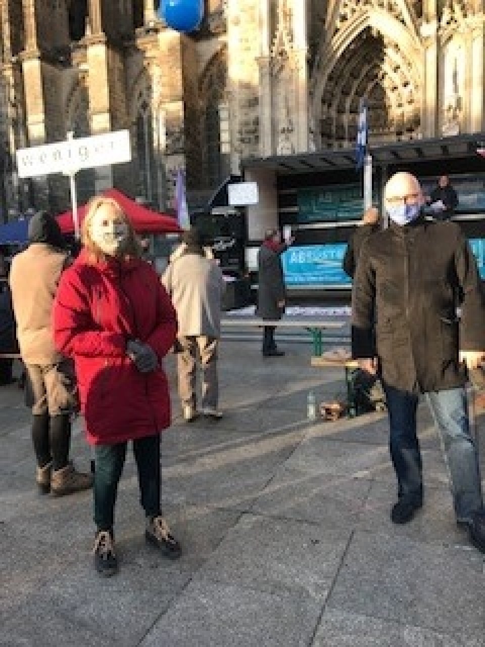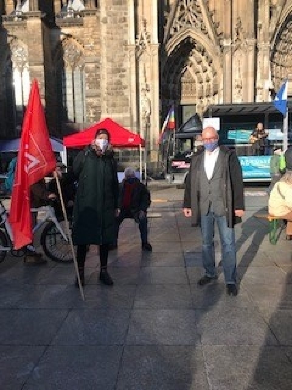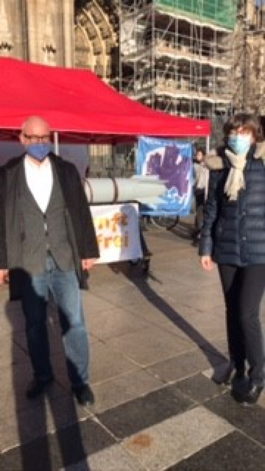 Am Samstag, 5. Dezember hatte ein breites Bündnis (u.a. DGB Köln, Kölner Friedensforum, Deutsche Friedensgesellschaft – Vereinigte KriegsdienstgegnerInnen Köln, Friedensbildungswerk e.V., AK Zivilklausel Uni Köln, VVN-BdA Köln, Kölner Aktionsbündnis gegen Verdrängung und Mietenwahnsinn, Fridays for Future Köln, Seebrücke Köln, DIDF) zur Kundgebung aufgerufen. Es sollte öffentlich, aber natürlich Corona-konform mit Abstand für Frieden und Abrüstung ein Zeichen gesetzt werden.