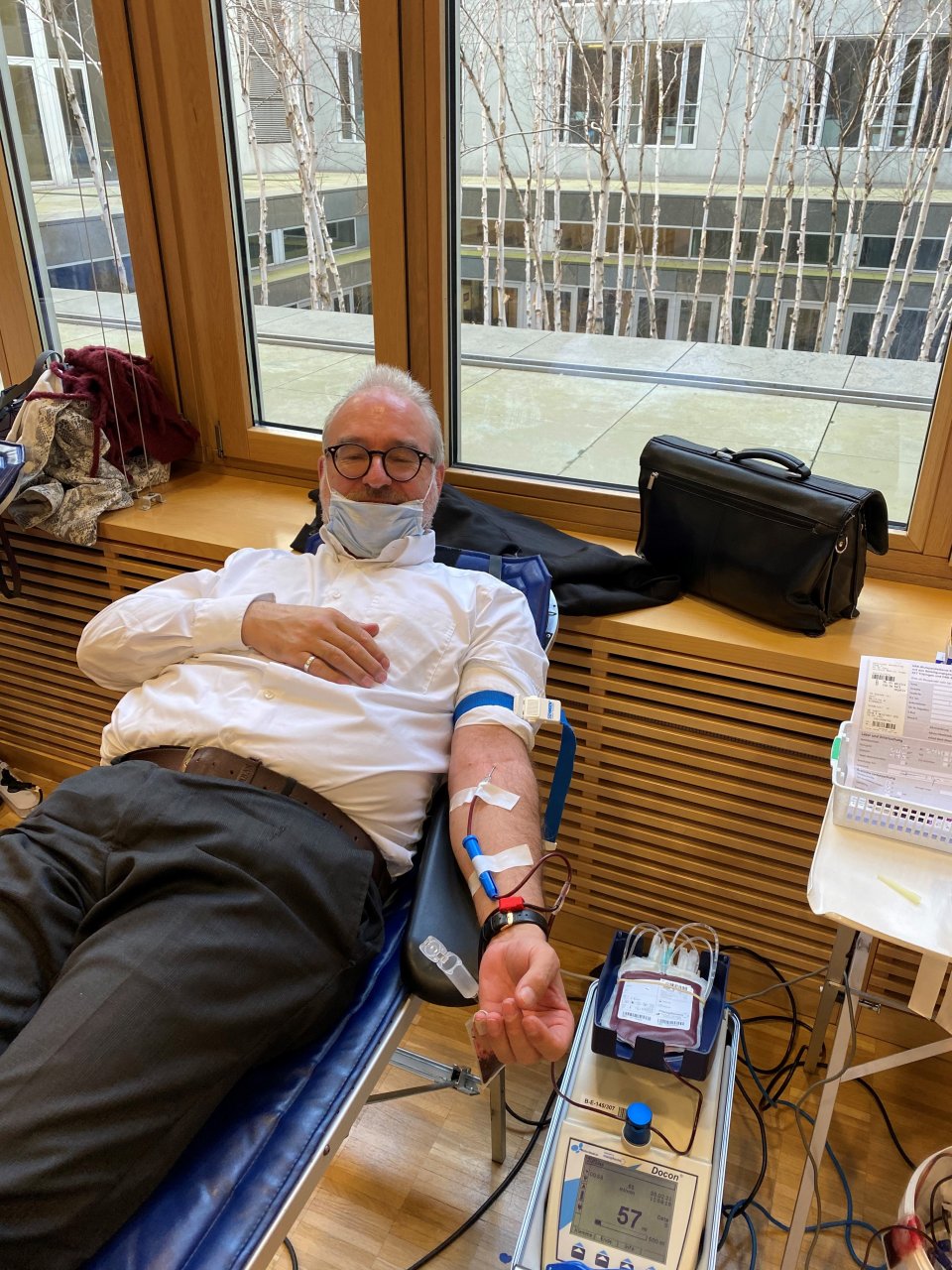 Zur Teilnahme an der Blutspende im Deutschen Bundestag musste man Matthias W. Birkwald nicht zwei Mal bitten. Seinen medizinischen Mund-Nasenschutz zog er sich selbstverständlich direkt nach der Fotoaufnahme wieder über die Nase.