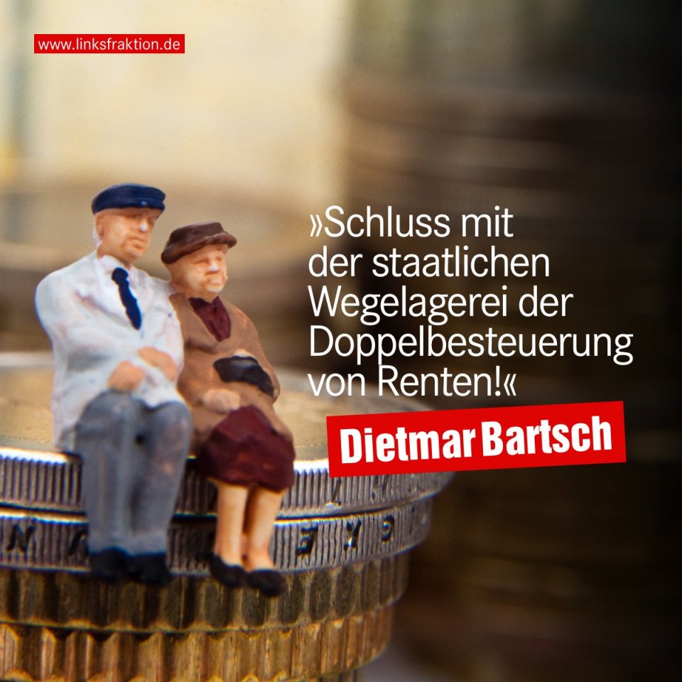 DIE LINKE im Bundestag fordert deshalb: 1. die sofortige Anhebung des steuerfreien Existenzminimums von 9.408 auf 14.400 Euro jährlich, 2. die Doppelbesteuerung der Renten so weit wie möglich einzudämmen und darum die Stufen bis zur vollständigen nachgelagerten Rentenbesteuerung von 2040 bis 2070 zu verlängern, und 3. fordert DIE LINKE eine außerordentliche Rentenerhöhung, die zu einem lebensstandardsichernden Rentenniveau und einer automatischen Neuberechnung des individuellen Rentenfreibetrags führen würde.