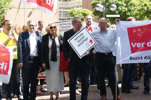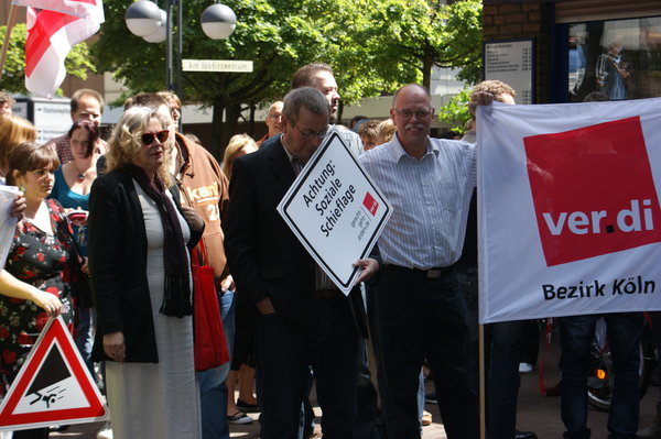 Deshalb startete ver.di am 09. Juni 2012 die Aktion "5 Minuten nach 12" vor der Bundesagentur für Arbeit und dem Jobcenter Köln. Ca. 150 MitarbeiterInnen des Jobcenter Köln, ob befristet oder unbefristet, kamen zur Mahnaktion.