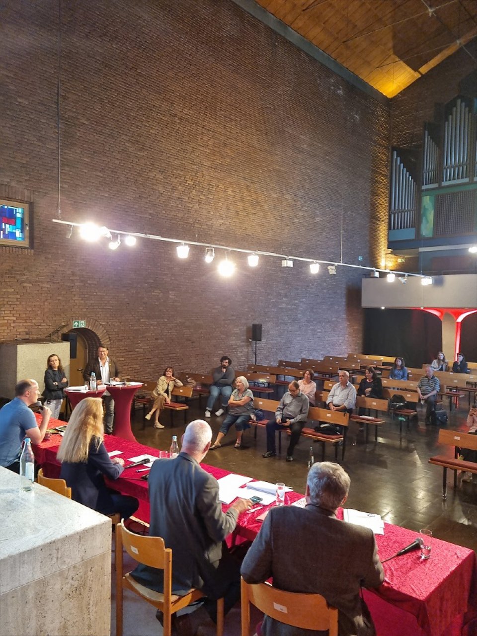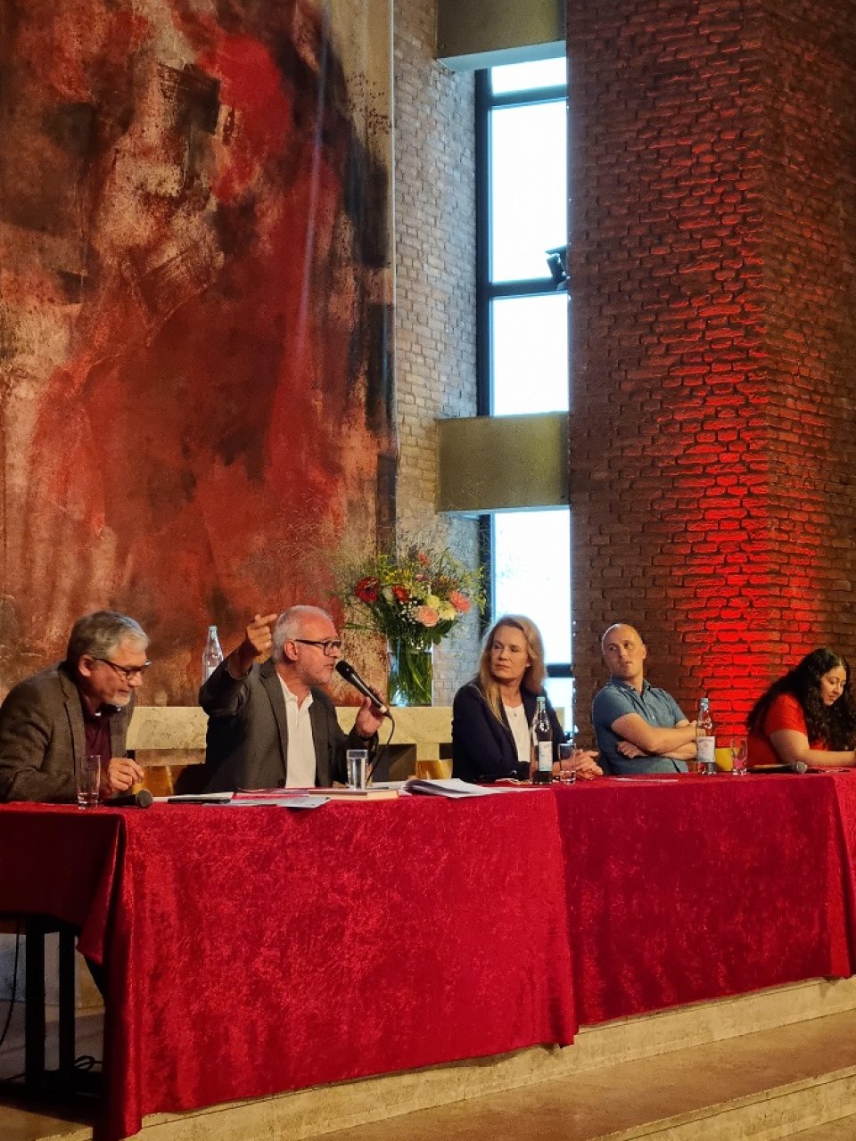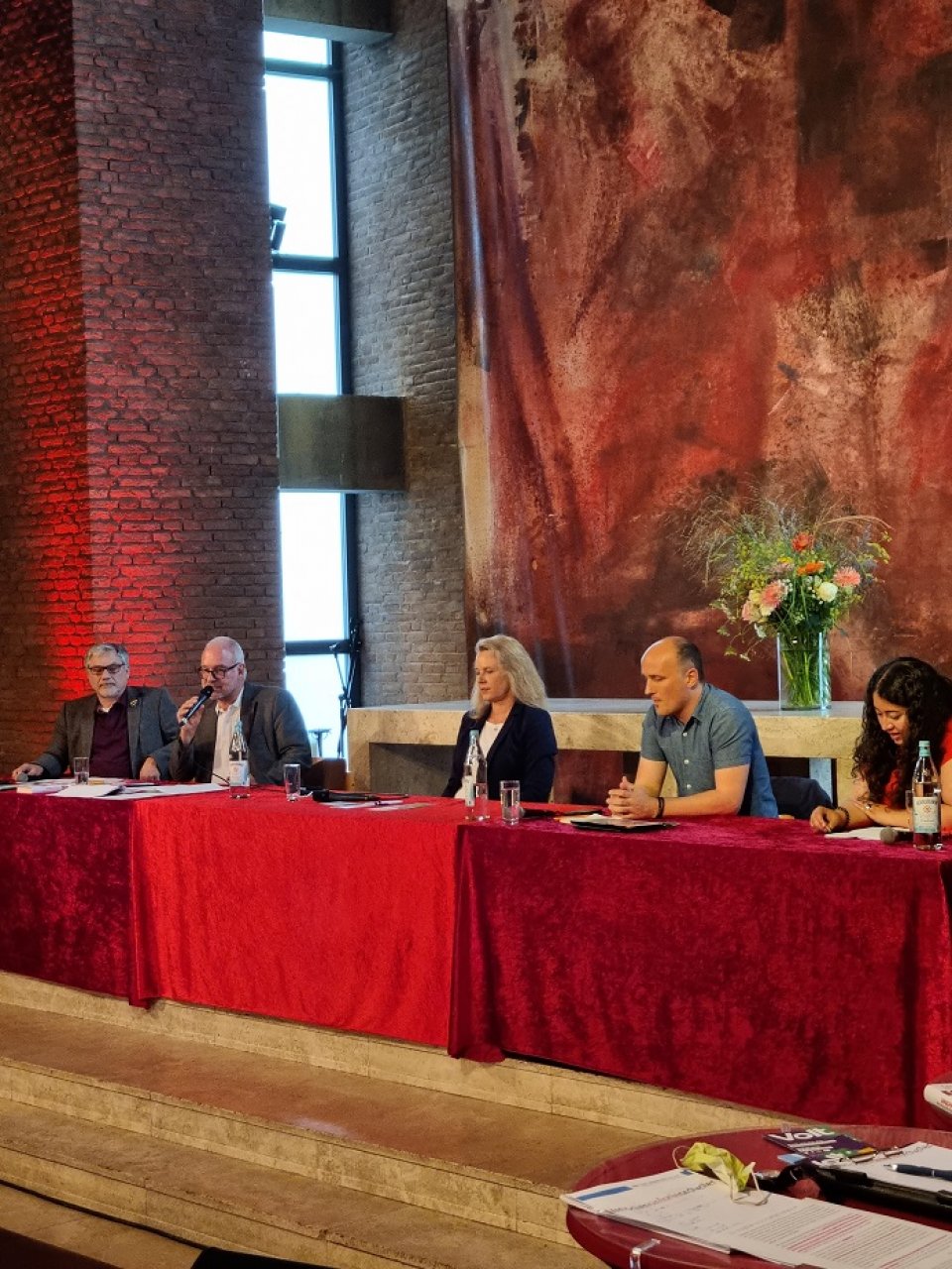 Auf dem Podium: Olivier Fuchs (VOLT), Matthias W. Birkwald MdB (DIE LINKE), Dr. Sandra von Möller (CDU), Sven Lehmann MdB (BÜNDNIS/ DIE GRÜNEN), Sanae Abdi (SPD).