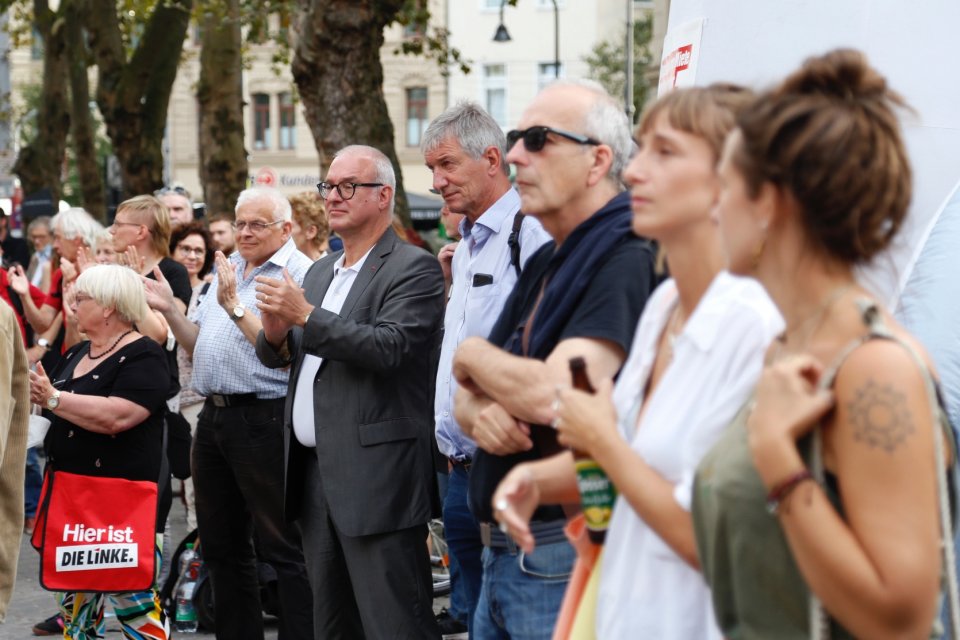 Kalle Gerigk rief auf zur Teilnahme an der bundesweit beworbenen mieten- und wohnungspolitischen Demonstration in Berlin am 11.9. Angelika Link-Wilden warb für die Demo „Weg frei“ des Kölner Bündnisses „kölnzeigthaltung“ für eine sofortige Aufnahme Geflüchteter am 12.9. Im Anschluss an die Rede Janine Wisslers und die tolle Live-Musik von Calum Baird habe ich in meinem Beitrag für einen Kurswechsel in der Rentenpolitik gesprochen.
