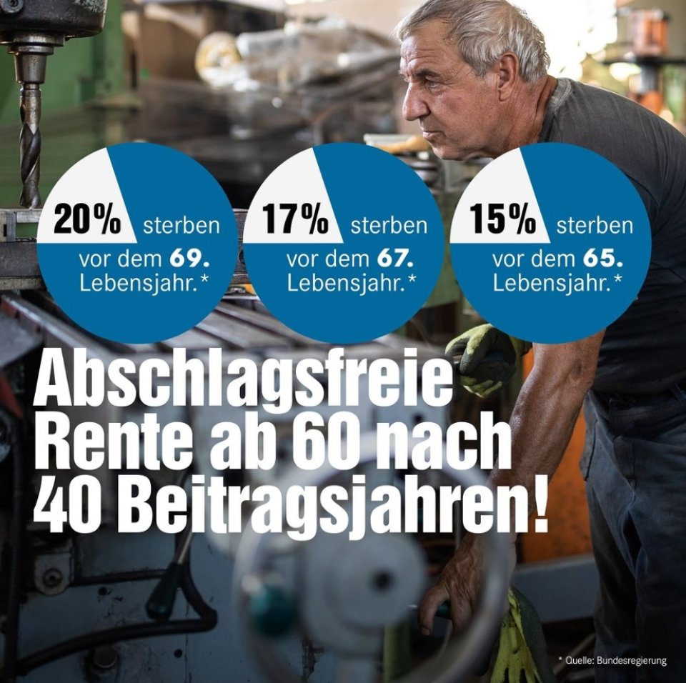 „Eine weitere Verlängerung der Lebensarbeitszeit – egal nach welchem Modell – wäre eine gigantische Rentenkürzung und träfe vor allem diejenigen mit den geringsten Renten und den geringsten Alterseinkommen am härtesten. Das sind aber gleichzeitig diejenigen, die in unserer Gesellschaft in den vergangenen Jahrzehnten, die härtesten körperlichen und auch psychisch anstrengendsten Arbeiten geleistet haben und leisten, wie zum Beispiel Fliesenleger, Straßenbauer, Müllmänner, Kanalreiniger, Schichtarbeiter und Schichtarbeiter, Altenpflegerinnen, Kassiererinnen, Krankenschwestern, Köchinnen und Köche, Fließbandarbeiterinnen und Fließbandarbeiter.