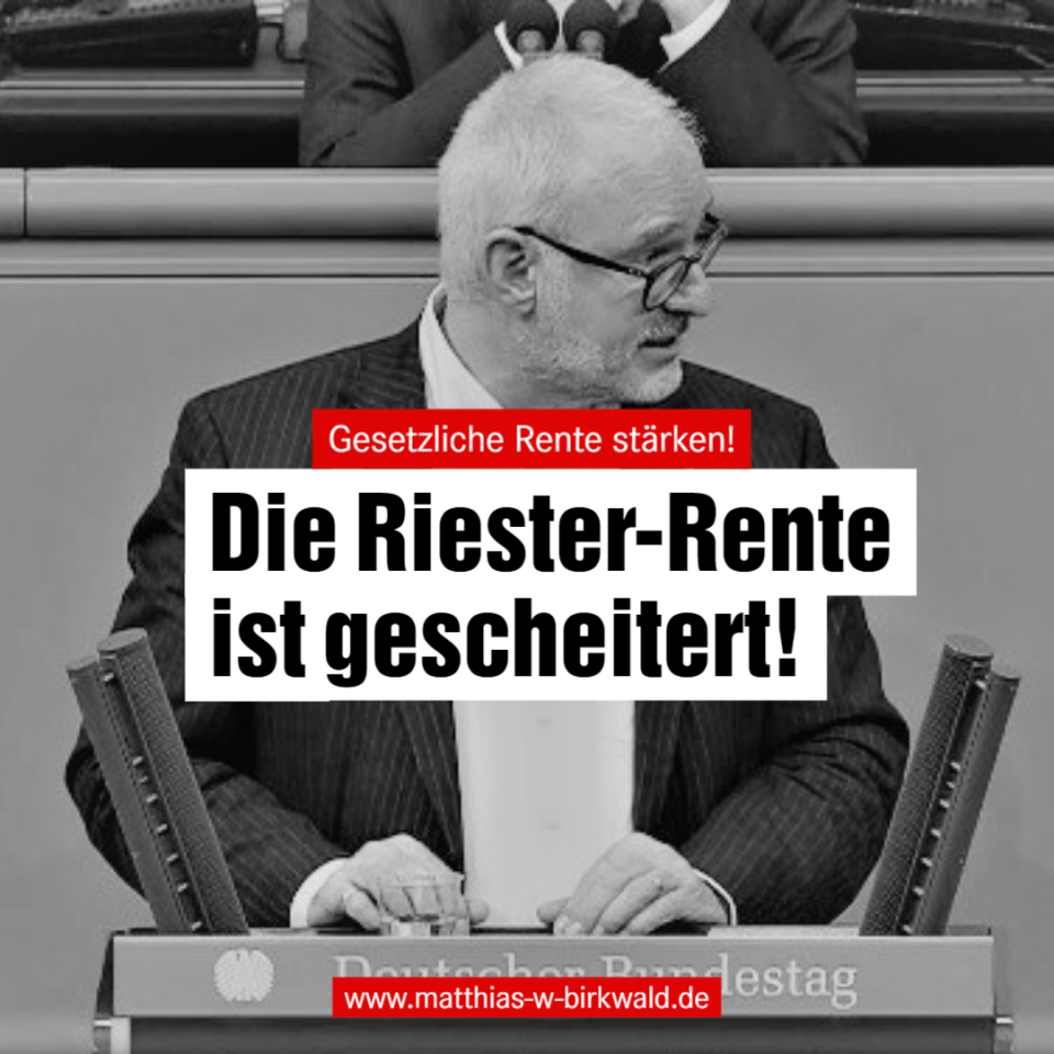Riester ist gescheitert! Daher wollen wir LINKEN die Gesetzliche Rente stärken (hier klicken, um zu unserem Antrag im Deutschen Bundestag zu gelangen).