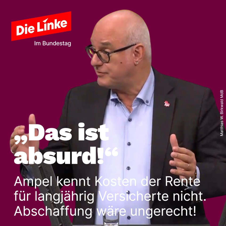 »„Die Bundesregierung kann noch nicht einmal die aktuellen Kosten für die Rente für besonders langjährig Versicherte benennen“, so Birkwald. „Aber die FDP behauptet dennoch, diese sei zu teuer? Das ist komplett absurd!“ (...) Birkwald spricht bei den Freien Demokraten von rentnerfeindlichen und marktradikalen Forderungen, „die noch nicht einmal auf einer evidenten Grundlage beruhen“, und formuliert klare Worte an die Ampel-Koalition: „Hände weg von der fälschlicherweise sogenannten ‚Rente ab 63‘!“«