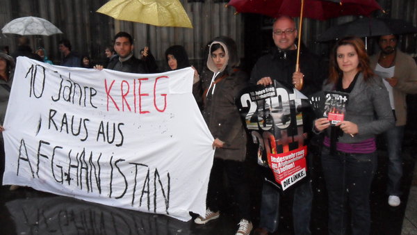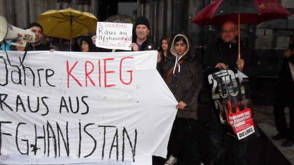 Am Mittwoch, den 12. Oktober 2011 fanden sich trotz strömendem Regen LINKE und Friedensaktivist_innen vor dem Kölner Dom zu einer Kundgebung anlässlich des 10. Jahrestages des Krieges in Afghanistan zusammen.