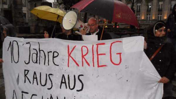 Am Mittwoch, den 12. Oktober 2011 fanden sich trotz strömendem Regen LINKE und Friedensaktivist_innen vor dem Kölner Dom zu einer Kundgebung anlässlich des 10. Jahrestages des Krieges in Afghanistan zusammen.