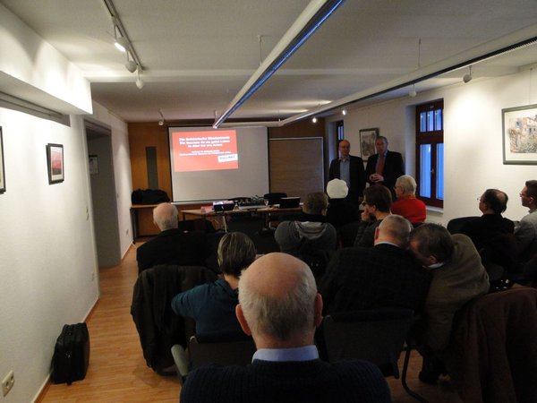Den Abschluss des Linken Thementages bildete das Forum am Abend im Hotel „Zur Alten Schmiede“ zum Thema „Solidarische Rentenversicherung – Für ein gutes Leben im Alter". Mattias W. Birkwald stellte vor vielen Interessierten Bürgerinnen und Bürgern das Konzept zur Änderung der Rentenversicherung und die Ideen der LINKEN ausführlich und sehr verständlich dar. Auch hier war danach eine sehr rege und auch kontroverse Diskussion zum Thema willkommen. „Wir haben uns sehr gefreut, dass so viele Interessierte den Weg zu uns gefunden haben“, bedankte sich Roland Claus als Moderator der Veranstaltung bei den Gästen.