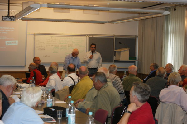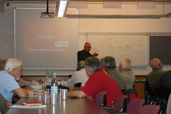 Am 20. September 2012 diskutierte ich mit dem Senior_innenausschuss der IG Metall Köln im DGB-Haus über die Solidarischen Rentenversicherung. Vor ca. 50 interessierten Seniorinnen und Senioren begrüßte mich Mario Utess, als langjähriges Mitglied der IG Metall. Nach meinem Vortrag ergab sich rasch eine lebhafte Diskussion. Eine kritische Auseinandersetzung gab es zu den Bereichen Beitragsbemessungsgrenze, Pensionen vs. Rente und den Standpunkten der Gewerkschaften. Darüber hinaus war die Meinung des Auditoriums, dass die Rentenproblematik unbedingt den jüngeren Arbeitnehmer_innen näher gebracht werden müsse.
