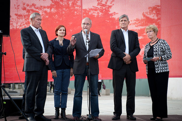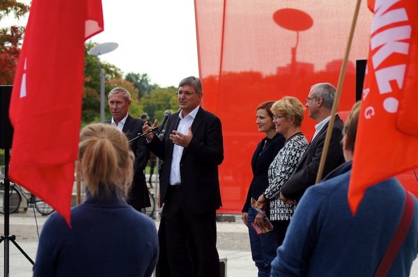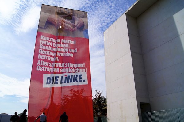 Die Bundesregierung hat bei ihrem Amtsantritt versprochen, die Ostrenten an das Niveau im Westen anzupassen. Passiert ist - wie bei den Vorgängerregierungen auch - nichts. Mit einem 14 Meter langen Transparent rückte DIE LINKE am 01.10.2012 vor dem Kanzleramt an, um Angela Merkel an ihr Versprechen zu erinnern: »Frau Bundeskanzlerin, halten Sie Wort! Altersarmut stoppen! Ostrenten anpassen!«