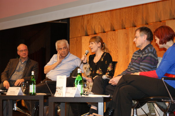Anschließend moderierte meine Abgeordnetenkollegin und hochschulpolitische Sprecherin der LINKEN Bundestagsfraktion, Nicole Gohlke, den Abend. Neben mir saßen als Gäste Theodoros Paraskevopoulos (Berater der Parlamentsfraktion des griechischen Linksbündnisses SYRIZA), Prof. Dr. Christoph Butterwegge (Professor für Politikwissenschaft, Universität zu Köln) und die Parteivorsitzende der LINKEN, Katja Kipping, auf dem Podium.