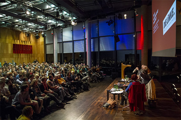 Der Saal platzte - wie so viele Hörsäle auch - aus allen Nähten, so dass einige Studentinnen und Studenten einfach auf dem Boden Platz nahmen, um die Veranstaltung verfolgen zu können.
