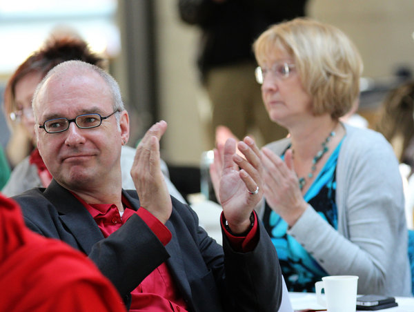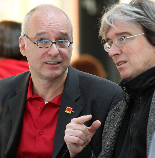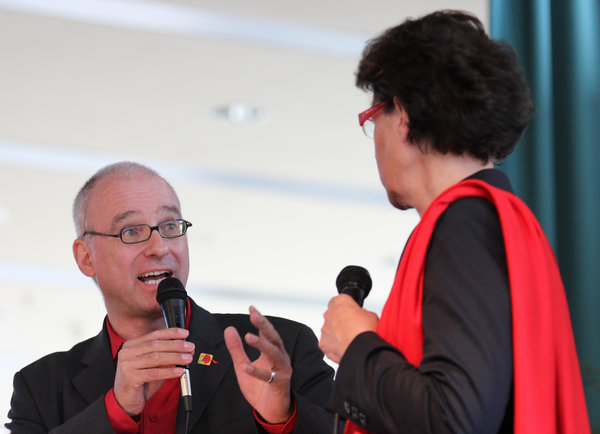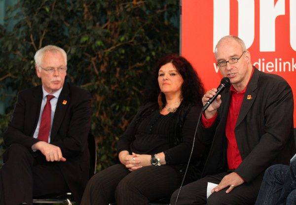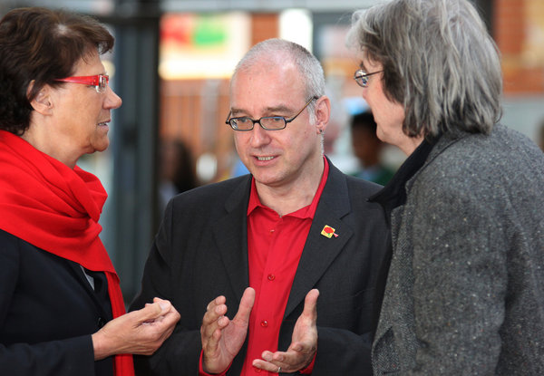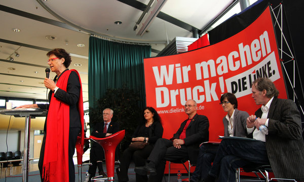 Pünktlich um 11.00 Uhr begrüßte die Kreisvorsitzende des KV-Wuppertal, Susanne Herhaus, die anwesenden Delegierten des Landesrats. Nach Abhandlung der Formalien ging es zur Diskussion über den Finanzplan des Landesvorstands. Nach eingehender, intensiver Beratung wurde dieser mit großer Mehrheit verabschiedet. Es folgte die Diskussion der Anträge. Der Nachmittag klang mit einer Podiumsdiskussion unter dem Motto „Gute Arbeit für alle ist möglich – umverteilen jetzt“ aus. An der spannenden Debatte nahmen (v. li.) der DGB-NRW-Vorsitzende Andreas Meyer-Lauber, Anna Salmen-Irmsch, MDB Matthias W. Birkwald, Inge Hannemann und Norbert Wiersbin teil. Landessprecherin Gunhild Böth (vorne) moderierte das Ganze.