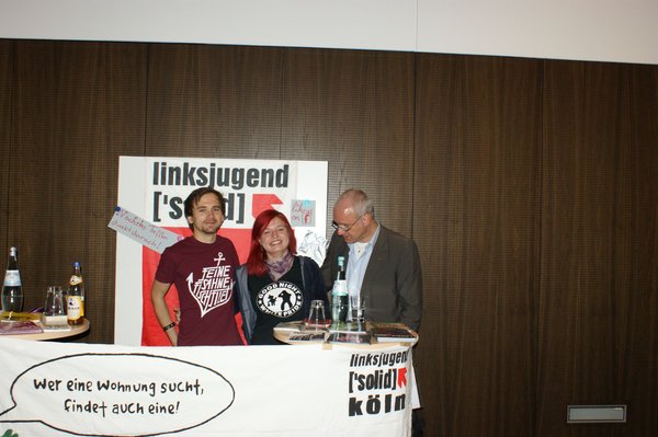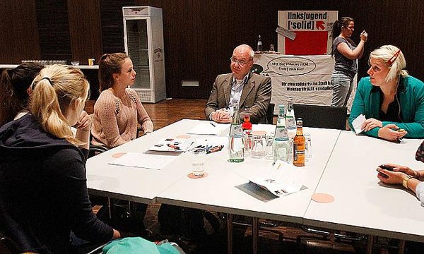 Zu Beginn hatten alle Kandidat_innen Gelegenheit, sich kurz vorzustellen. Dann wurden an insgesamt fünf Tischen kleine Gruppen gebildet. Insgesamt waren rund 28 junge Menschen zu dem Termin erschienen. In recht entspannter Atmosphäre wurde Sozialpolitik, Bildungspolitik, aber auch Ehegattensplitting, Infrastruktur, oder die aktuelle Lage in der Türkei diskutiert. Daneben spielte auch Persönliches oder die politische Motivation der Kandidat_innen eine Rolle. Pro Tisch standen 15 Minuten zum Austausch zur Verfügung, danach wurde der Tisch gewechselt. Im Anschluss an das Speed-Dating hatten die Jugendlichen noch Gelegenheit, sich über die Jugendorganisationen der Parteien zu informieren. DIE LINKE war selbstverständlich durch ['solid] gut vertreten.