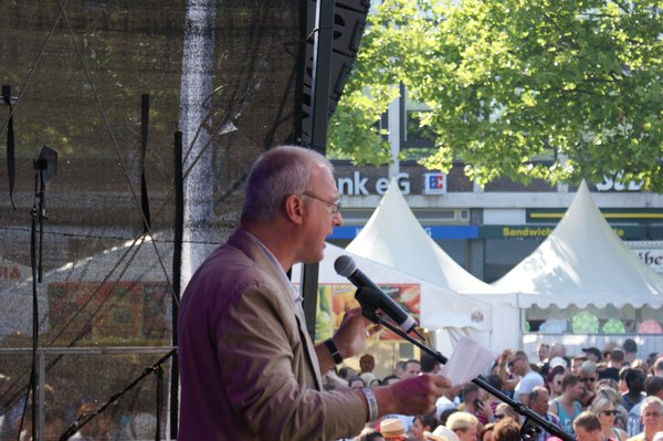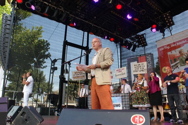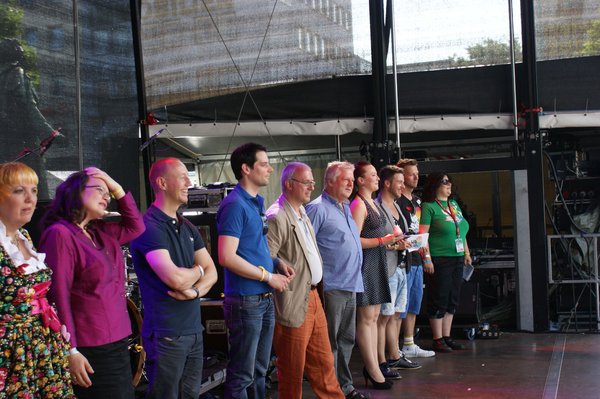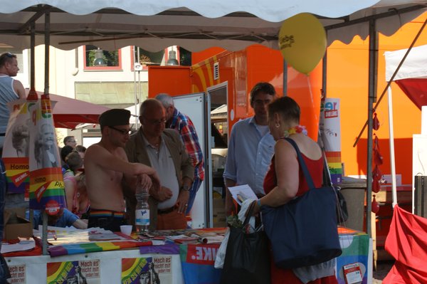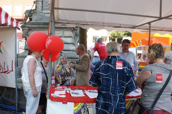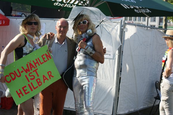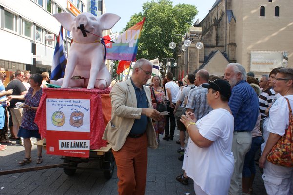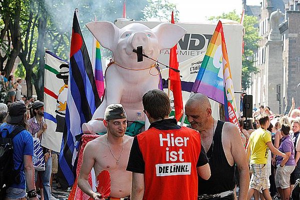 Ich hatte die Gelegenheit, die Parade persönlich zu begleiten, denn DIE LINKE war mit der rosaroten Sau, dem Sinnbild der durch's Dorf gejagten "schwulen Sau" und einem bunt geschmückten Wagen vertreten. Anschließend ging es zum Heumarkt, wo rund 40.000 Besucherinnen und Besuchern auf verschiedenen Bühnen noch Programm geboten wurde. Im Rahmen dessen fand auf der Hauptbühne eine Politrunde statt, bei der ich für DIE LINKE einen Redebeitrag lieferte, in dem ich u.a. das volle Selbstbestimmungsrecht für Transsexuelle und Entschädigungen für alle forderte, die durch den damaligen § 175 StGB verfolgt und verurteilt wurden. Mein Appell "Liebe wen Du willst und heirate wen Du willst", wurde jubelnd aufgenommen.
