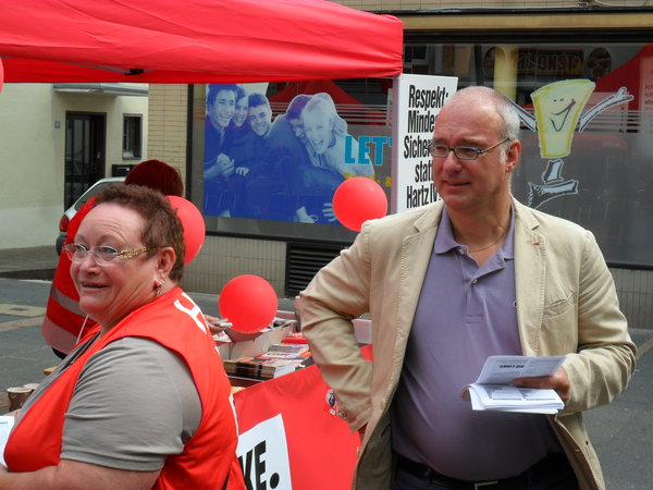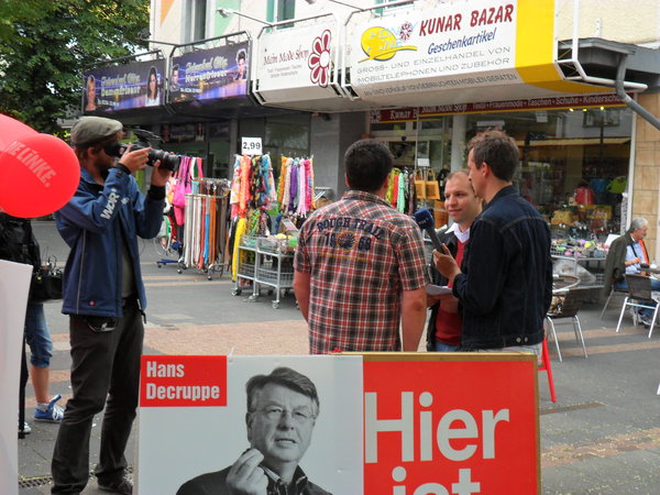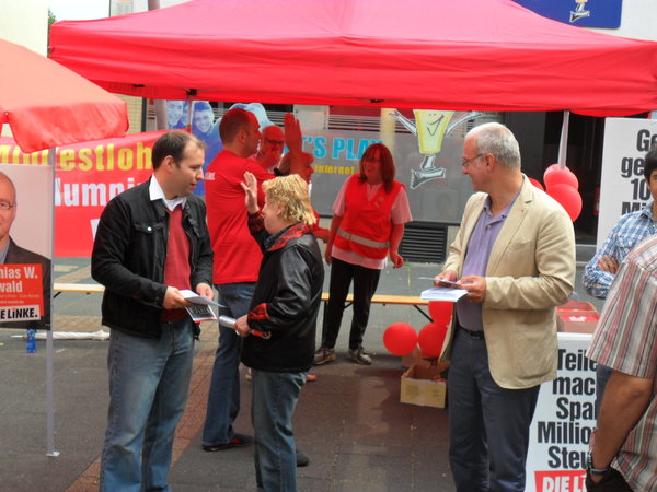 Dank der tatkräftigen Unterstützung vieler Genossinnen und Genossen, konnte DIE LINKE am 24.08. einen sehr erfolgreichen Infostand in der südlichsten Kommune des Rhein-Erft-Kreises organisieren. Es wurden hierbei viele Menschen erreicht. Neben dem rentenpolitischer Sprecher der LINKEN-Bundestagsfraktion, Matthias W. Birkwald, war auch Florian Völlger (http://wahl2013.dielinke-nrw.de/index.php?id=11948), Direktkandidat der LINKEN im Wahlkreis 92, voll in Aktion – eben 100 Prozent sozial. Florian Völlger wurde an diesem Tag von einem Kamerateam des Westdeutschen Rundfunks begleitet. Anfang September wird der WDR die Aufnahmen ausstrahlen.