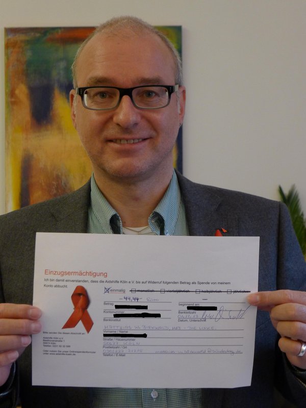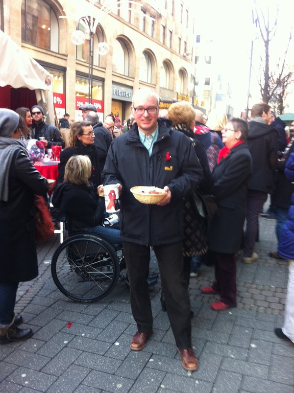 Bei der Informations- und Sammelveranstaltung der AIDS-Hilfe Köln zwischen Schildergasse und Hohe Straße sammelte ich am Welt-AIDS-Tag über dreißig Euro. Dazu kommt noch meine persönliche Spende in Höhe von 44,44 Euro, die ich an die AIDS-Hilfe Köln überwiesen habe.