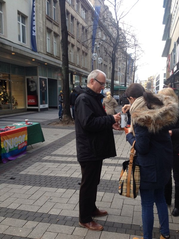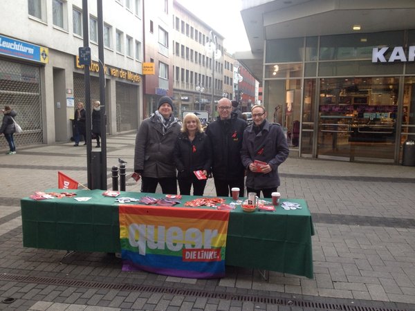 Auf der Breiten Straße in Köln führte ich anschließend am Stand der Landesarbeitsgemeinschaft Queer der LINKEN. NRW viele Gespräche mit Passant_innen über die Solidarität mit von AIDS und HIV betroffenen Menschen. Dabei sammelte ich nochmals über 20 Euro für die Kölner AIDS-Hilfe.