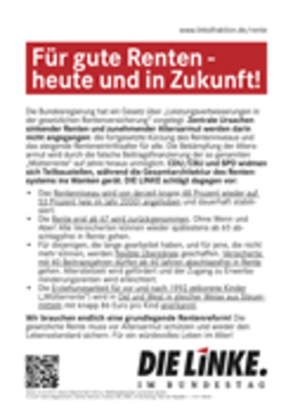 Die Bundesregierung hat ein Gesetz über „Leistungsverbesserungen in der gesetzlichen Rentenversicherung“ vorgelegt. Zentrale Ursachen sinkender Renten und zunehmender Altersarmut werden darin nicht angegangen: die fortgesetzte Kürzung des Rentenniveaus und das steigende Renteneintrittsalter für alle. Wir brauchen endlich eine grundlegende Rentenreform. Für ein würdevolles Leben im Alter! Hier unsere Vorschläge als Flugblatt.