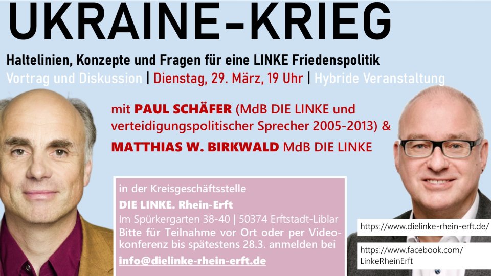 Für diese Diskussion steht mit Paul Schäfer (MdB für DIE LINKE von 2005-2013) ein echter Experte für LINKE Außen- und Sicherheitspolitik zur Verfügung. Zudem wird mit Matthias W. Birkwald MdB auch der rentenpolitische Sprecher der Bundestagsfraktion DIE LINKE vor Ort sein und über den aktuellen Diskussionsstand in der Fraktion berichten.